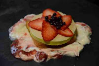 | Capricho de foie y yoghourt con fresas, caviar de chocolate y caramelo balsámico. |