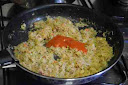 Una vez pochado añadimos la carne de buey de mar, envolvemos bien, salteamos un par de minutos y añadimos una copita de brandy de Jerez. Flambeamos.