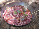 Empezamos poniendo en la trébede la carne del cordero (piernas y paletillas) ya troceadas por el carnicero.