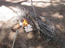 Para hacer el fuego no hace falta solo una buena leña. Hacen falta unas buenas manos, como para casi en todo en esta vida. Unos troncos de laurel hacen de cama, un par de hojas de la prensa de ayer, unos sarmientos para que arranque bien y algún que otro tronco menudo. Ojo no pongáis mucha cantidad, dejar huecos, que si no se ahoga. Et voilà.