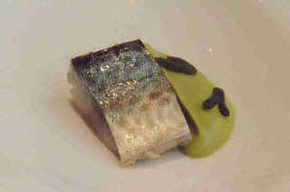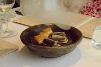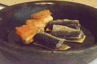 - Tabla de pescados humildes ahumados en brasas de aceitunas. Un combinado de pastela de ventresca de jurel ligeramente adobada, junto a una coca de sardina sobre crema de berenjena. Plato extremadamente sutil y delicioso que me emocionó al descubrir que en su momento yo preparé unos platos de idea similar (salvando las distancias y la elaboración) partiendo de una "simple" sardina ahumada.