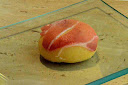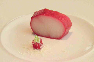 - Surimi fresco de pescados "clandestinos". Es el caso del "tomaso" (escualo parecido al pez mantequilla), que más que clandestino es "feo", donde aprovechando su textura firme pero delicada y su carne blanca grasa, se macera ligeramente en remolacha y jengibre. El aspecto no me digáis que no es similar al surimi, pero nada más lejos de la realidad ni tan natural como éste.