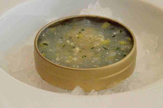 - El origen de la vida... en una lata. Berberecho, la gelatina ligera de su breve cocción, fruta de la pasión y pepino, y en el fondo, plancton. Se remata en la mesa con ralladura de crin (raíz marroquí).