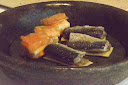 - Interiores de calamares... hechos empanadillas. Similares a unos raviolis de calamar rellenos de los mismos y guisados a la cochambrosa (guiso tradicional gaditano) con una infusión de menta poleo y mojama.