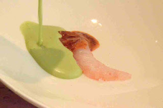 - Corte de gamba atemperada en la candela... ajo verde. Buena gamba blanca de la tierra, cruda, con todo su coral, junto con ajo verde a base de ajo blanco, huevas de pez volador, wasabi y lima.
