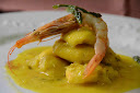 Carrilleras de rape al azafrán con gambas y trigueros.