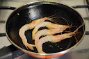 Momentos antes de emplatar, salteamos en una sartén con un poco de aceite las gambas blancas, peladas pero manteniendo su cabeza y la cola.