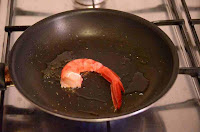 Ponemos en una sartén una cucharadita de aceite y pasamos los carabineros por la plancha, ligeramente, vuelta y vuelta, para que cojan un poquito de color pero queden enteros, con todo su sabor (no más de un minuto por cada cara).