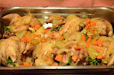 En un plato llano colocamos en el centro las patatas panaderas y sobre éstas media pechuga y un muslito. Adornamos con una hojita de romero fresco, salseamos y listo.