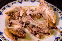 Pasado este tiempo, abrimos la cazuela, sacamos las perdices y las deshuesamos, obteniendo por una parte las pechuguitas y por otra los muslitos (éstos si llevarán el hueso).