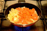 En esa misma sartén, y con el mismo aceite en donde freímos las perdices (eso sí, con mucho menos), pochamos ligeramente las cebollas cortadas en brunoise y las zanahorias cortadas en en aros gruesos (como de un dedo) con una pizca de sal.