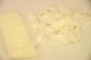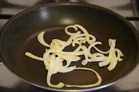 en tiras finas, a modo de tallarines, y luego a la mitad, como formando espaguetis.