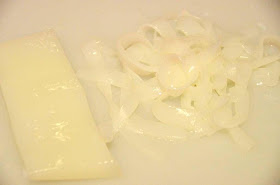 en tiras finas, a modo de tallarines, y luego a la mitad, como formando espaguetis.