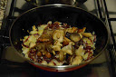 Empezamos preparando las setas, pues es lo que más tiempo se llevará. Ponemos en una sartén un poco de aceite de oliva y pochamos la cebolla cortada en brunoise.