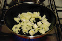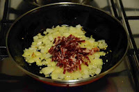 Cuando esté doradita incorporamos el jamón cortado en daditos finos y salteamos ligeramente (como medio minuto).