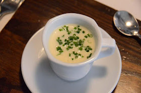Antes de nada un aperitivo: Sopa de patata, cremosa, ligera, de mucha intensidad, con recuerdos marinos marcados a la vez que tenues. Buen inicio, la cosa apuntaba bien.