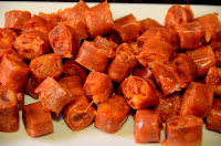 En la misma sartén repetimos la operación con la chistorra cortada en daditos, pero en esta ocasión añadimos un poquito más de aceite. Cuando esté echa (ligeramente crujiente), retiramos, escurriendo el aceite y reservamos.