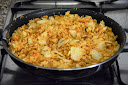 Cuando estén dorados, incorporamos una cucharada sopera de pimentón dulce. envolvemos rápidamente para que no se nos queme.