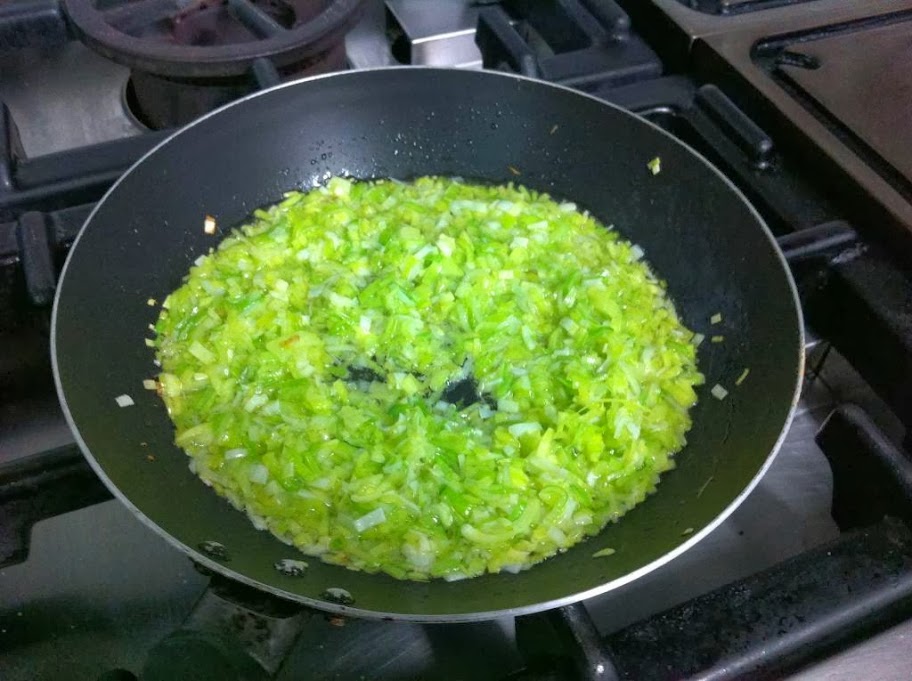 Por otra parte lavamos el puerro y lo cortamos en brunoise fina y lo salteamos en una sartén con cuatro cucharadas de aceite de oliva y la mantequilla y una pizca de sal hasta que esté ligeramente caído.