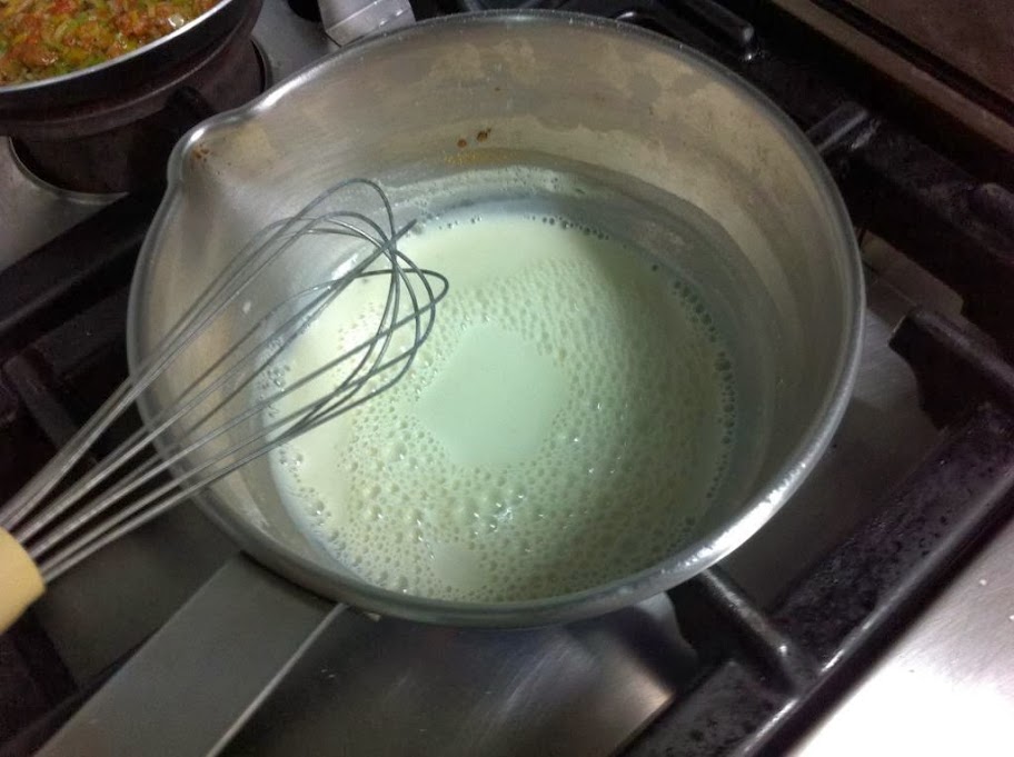 Ponemos en un cazo la harina y añadimos la leche (del tiempo) y el agua de oricios (que no es más que el agua de mar que tenía en su interior cuando los abrimos). Calentamos a fuego medio removiendo con unas varillas hasta conseguir una bechamel ligera.