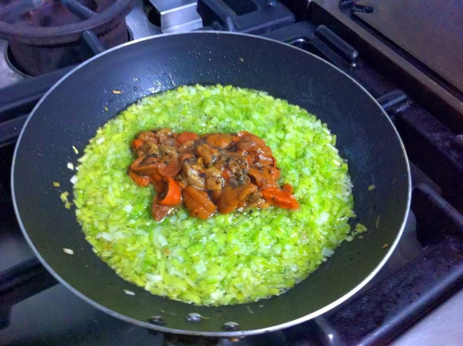 Añadimos el salteado de puerro y oricios y envolvemos bien con la ayuda de las varillas.