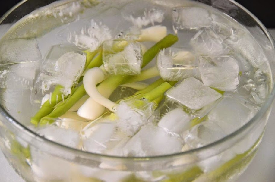 En ese momento sacamos con la ayuda de una espumadera, y mucho cuidado, y las introducimos en un cuenco con agua y hielo (para parar la cocción).