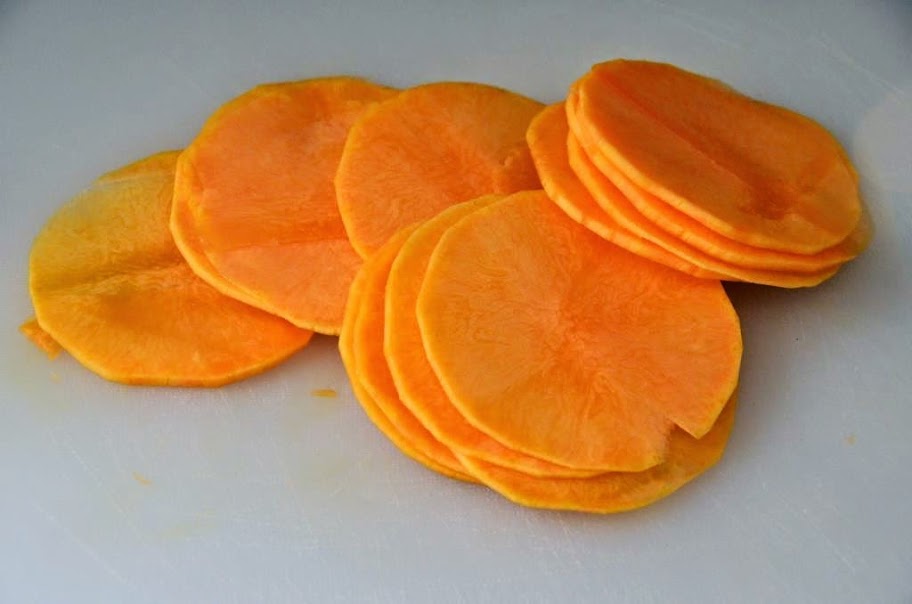 Por otra parte pelamos la calabaza y, con la ayuda de una mandolina, cortamos rodajas como de 1,5 mm de espesor (en total emplearemos 5 lonchas por comensal).