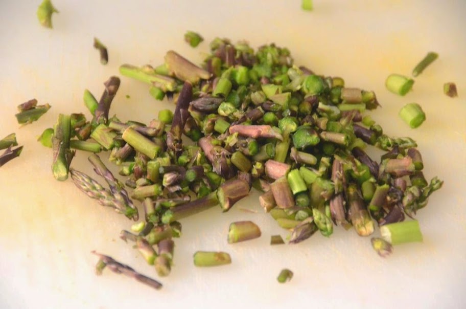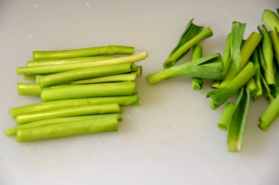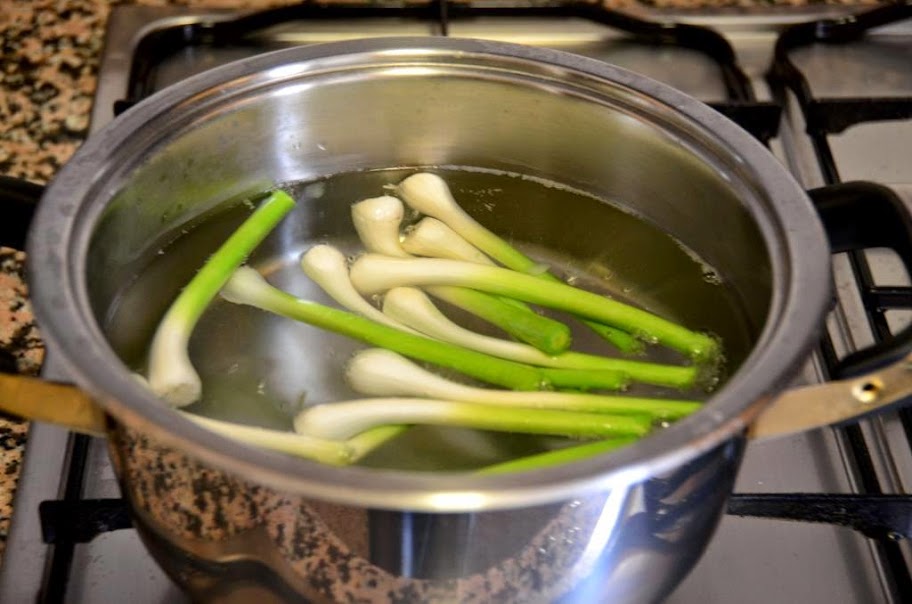 Añadimos los ajetes (salvo la parte blanca) y los trigueros. Envolvemos y dejamos hacer un par de minutos. Retiramos del fuego y reservamos hasta el momento de emplatar.