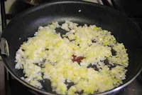 En una sartén ponemos a pochar la cebolla blanca picada en brounoise fina, con una pizca de sal.