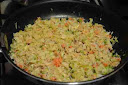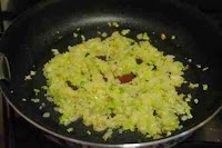 Cuando esté ligeramente dorada añadimos el puerro cortado de la misma forma. Rectificamos de sal y dejamos pochar igualmente a fuego lento.