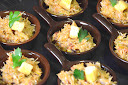 Rellenamos unas cazuelitas con el txangurro y colocamos en el medio un picatoste de pan y una hojita de perejil.