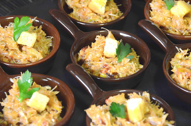 Observaciones: en muchos sitios el txangurro se remata en el horno, introduciendo estas cazuelitas hasta que dore el pan rallado que se pone por encima cubriendo la carne de buey. Yo he sustituido este proceso por el picatoste; simplemente es otra forma de prepararlo.