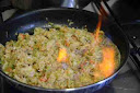Una vez pochado añadimos la carne de buey de mar, envolvemos bien, salteamos un par de minutos y añadimos una copita de brandy de Jerez. Flambeamos.
