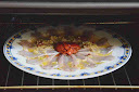 Colocamos en el centro unas tiras de pimientos del piquillo e introducimos en el horno precalentado a 200º C durante... POCO TIEMPO, unos cinco minutos, si, tan poco a simple vista, pero será suficiente para que se hagan. ¿No véis que son muy finos?...