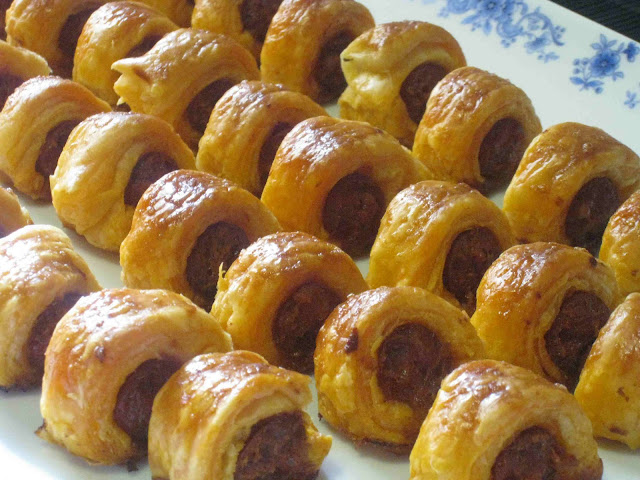 Colocamos los hojaldritos en una bandeja como si fueran soldados, en formación. No os vais a poder resistir el probarlos antes de llegar a la mesa, especialmente los que se quedan abiertos...
