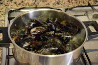 Ponemos una olla a fuego vivo con el vaso de vino blanco. Cuando rompa a hervir, echamos los mejillones bien lavados, a los que habremos retirado previamente la mayor parte de "barbas". Tapamos la olla, bajamos el fuego al mínimo y dejamos que se cuezan entre unos tres y cinco minutos, tiempo que estimamos habrá pasado para que se abran todos los mejillones.
