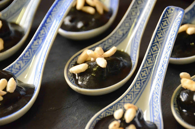 Pues nada amigos, aquí va otro de los platillos que preparé para mi cumple, una cucharita de mejillones en tinta de calamar. Un plato rápido y sencillo, a la vez que sorprendente.