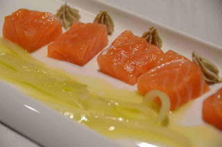 El primero unos tacos de salmón con crema de alcaparras, acompañados de unas cebolletas. Un plato de sabor suave aunque persistente, conseguido gracias a delicadeza del marinado y al ensamblaje de la crema de alcaparras, ligera de vinagre.