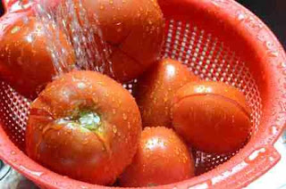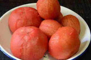 Pasados un par de minutos, o lo que es lo mismo, cuando vuelva a romper a hervir, retiramos los tomates, pasamos por agua fría y pelamos. Reservamos.