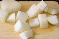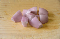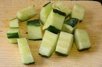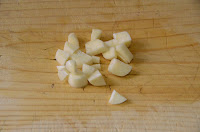 Por otra parte lavamos todas las hortalizas y seguidamente echamos al vaso de la thermomix el pepino en dados (al que habremos quitado, al menos, la mitad de la piel), el pimiento verde (despepitado) y cortado, el ajo pelado y picado (o entero) y la cebolla y la chalota peladas y picadas.