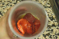 Tenía unos pimientos asados en el frigorífico (si queréis saber como los he hecho pinchad aquí), los he calentado ligeramente al microondas y al vaso de la batidora. Trituramos a máxima potencia hasta conseguir una textura fina. Reservamos. Y si no tenéis pimientos asados los podéis comprar ya preparados en el super.