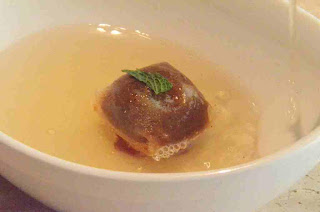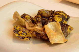 - Interiores de calamares... hechos empanadillas. Similares a unos raviolis de calamar rellenos de los mismos y guisados a la cochambrosa (guiso tradicional gaditano) con una infusión de menta poleo y mojama.