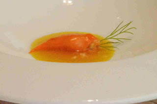 - El puntillón de traíña... que quiso ser zanahoria. Un juego más de Ángel que juega con los productos del mar y la cocina de su tierra. Una puntillita (que no puntillón), rellena de una picada de zanahorias aliñás a la gaditana y tuétano de pez espada, quiere pasar desapercibida como una zanahoria baby.