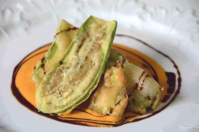 | Berenjenas en tempura con salmorejo y caramelo balsámico. |