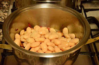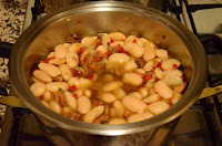 Mientras tanto sacamos los judiones del bote y lavamos bajo chorro de agua, no muy fuerte para que no se rompan, hasta que deje de salir espuma. Dejamos escurrir y los incorporamos a la olla.