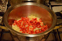 Cuando estén bien doraditas incorporamos el pimiento rojo también cortado en daditos.