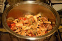 Y cuando esté pochadito añadimos los champiñones, previamente limpiados con un cepillito (y sin agua), y cortados en láminas gruesas.