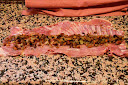 Para rellenar el lomo de cabrito, extendemos éste en la mesa y ponemos en su interior la farsa de cebolla y níscalos.