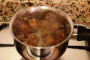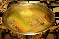 Una vez dorados los pasamos a una cazuela junto con dos zanahorias peladas, el puerro cortado a la mitad, la cebolla pelada y cuatro dientes de ajo. Cubrimos con agua, sazonamos y dejamos que cueza durante una hora.