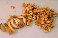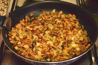 Cuando esté bien doradita, incorporamos unos níscalos también cortados en daditos. Salpimentamos y dejamos hacer unos tres minutos. Reservamos.